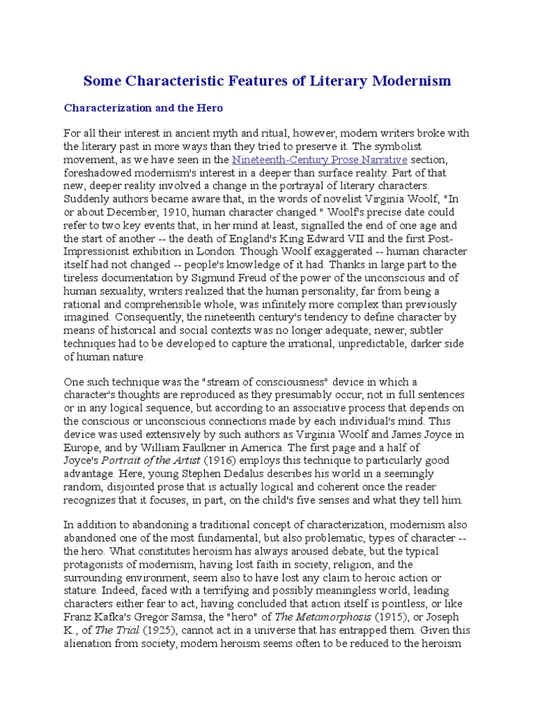 Modernism is characterized with a strong breakaway with the tradition, social, and political views of the society. At this period, literature was revolving around religion where authors based most of their works on religion. On the other hand, others were being inspired by the social and political views that were prevalent in the ancient society Modernism in Literature The literary movement that spanned from the late 19th century until roughly is referred to as modernism. When talking about the movement there must be an understanding of the difference between modernism and the more common word “modern”. The word modern refers to what is new, recent, and updated · Modernism is the literary movement that is considered an overturn of traditional writing ways—modernists engaged in writing with technological advances and societal changes. Modernism is a break from the past and a concurrent search for new forms of expression