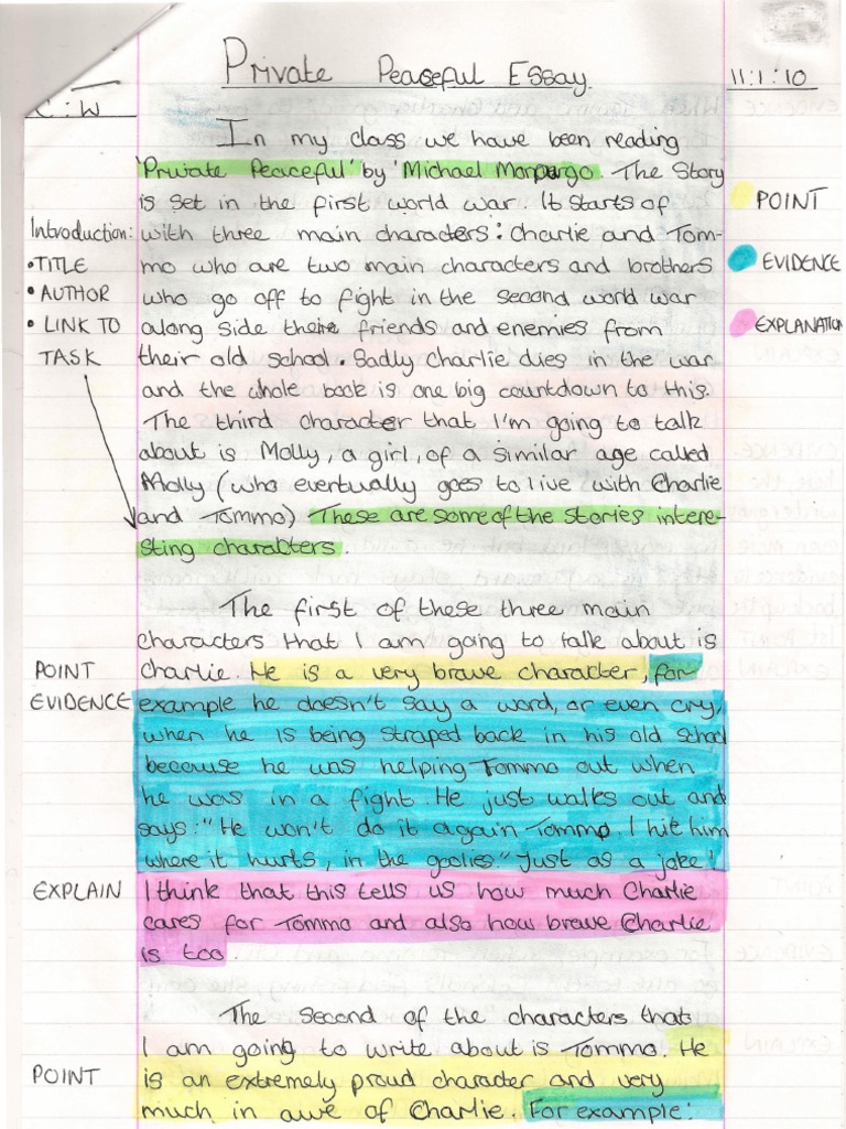 Charlie and Tommo are the main characters of the novel Private Peaceful, written by Michael Morpurgo. The boys head off in search of their “great adventure,” spending time training in the Salisbury Plains, England and in Etaples, France. Life in the training camps was a complete new experience from their normal day to day life in rural England 11/09/ · In private Peaceful family members are emotionally, linked and have a strong bond. There are several aspects of the Peaceful family, such as the values, love and supports to each other, but not all of the family have this kind of values. In Private Peaceful the family shows a good of a family who love each other no matter what “Private Peaceful Essay” Get High-quality Paper helping students since His brother, Charlie, piggybacks him there. Tommo’s shoelaces are untied and he can’t tie them. A girl called Molly ties his shoelaces Tommo immediately falls in love. Mrs. Peaceful takes up a job caring for the colonel’s wife. So Grandma Wolf comes to stay